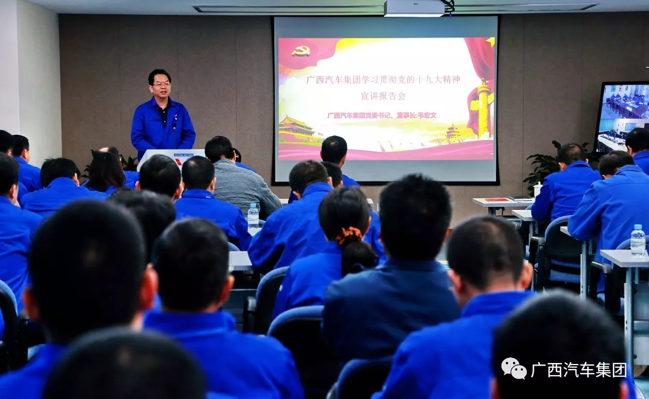 為深入學(xué)習(xí)貫徹黨的十九大精神,?12月6日,廣西汽車集團(tuán)舉行學(xué)習(xí)貫徹黨的十九大精神宣講報(bào)告會(huì),廣西汽車集團(tuán)黨委書記、董事長韋宏文在會(huì)上作題為《新時(shí)代·新氣象·新作為》宣講報(bào)告。集團(tuán)公司黨委領(lǐng)導(dǎo)、各級(jí)黨組織書記、一級(jí)經(jīng)理、所屬企業(yè)負(fù)責(zé)人等一百多人現(xiàn)場(chǎng)聆聽了報(bào)告,山東、重慶、桂客等單位以視頻形式參加報(bào)告會(huì)。